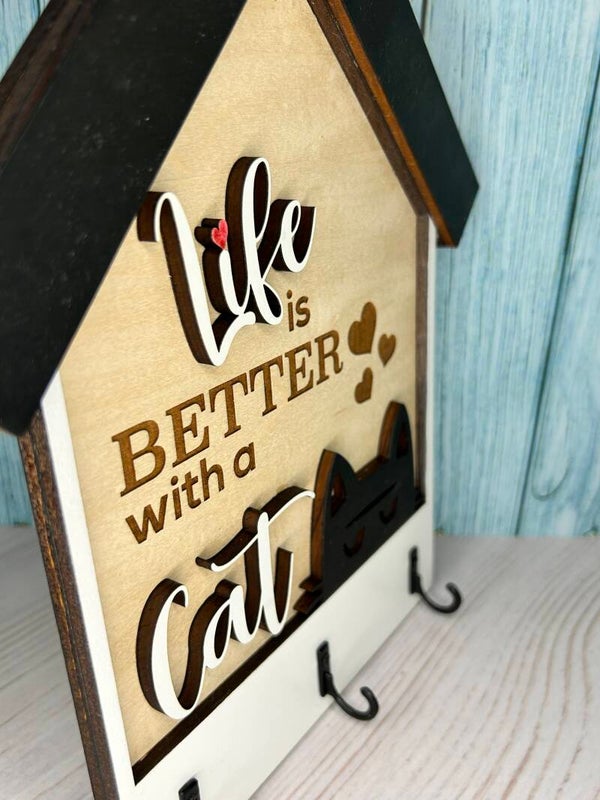 Key plaques adorned with hearts, and peeking cat to symbolizing the love for your four-legged cat. Each plaque features three key hooks and utilize the small piece provided with the plaque to align and mark the holes for mounting. Secure the screws in the marked spots, ensuring the key holder fits seamlessly and snugly against the wall, locking it firmly in place. Measures 6.5"w x 10.75"h x .5" deep.