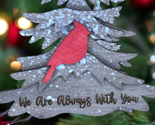 Behold the Red Cardinal nestled in this hand-painted tree, crafted from Walnut Pro Plywood. The piece features either a solitary red cardinal with the engraved message, I am always with you, or a pair of cardinals with the inscription, We are always with you. Due to the hand-painted nature, each finish is unique. This elegant creation comes with a silk ribbon and is exquisitely packaged in a gift box, making it an ideal and thoughtful present.