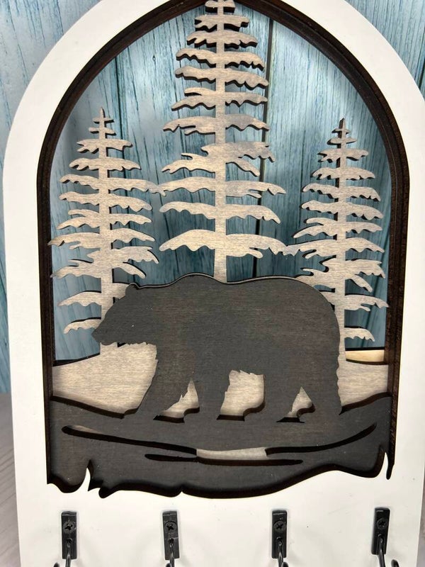 A beautifully crafted wooden arch plaque showcases a black bear strolling amidst forest trees. This three-layered piece is meticulously hand-stained and painted, and comes equipped with four key hangers. Installation is made easy with the provided template for accurate alignment and hole marking. Dimensions are 6.25 inches wide, 9.5 inches high, and 0.75 inches deep.