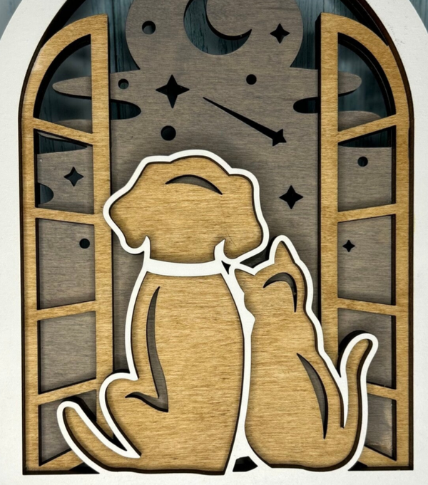 This charming wooden arch key plaque showcasing a heartwarming scene of a dog and cat gazing at the moon and stars through a window. This three-layer piece is meticulously hand-stained and painted, offering a unique touch of craftsmanship. It features four key hangers for your convenience. For easy installation, use the included template to accurately align and mark the mounting holes. Dimensions: 6.25" wide, 9.5" high, and 0.75" deep.